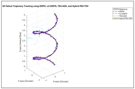 Three-dimensional helical trajectory tracking performance using DDPG, LC-DDPG, TD3-ADX, and TD3 + PID controllers.