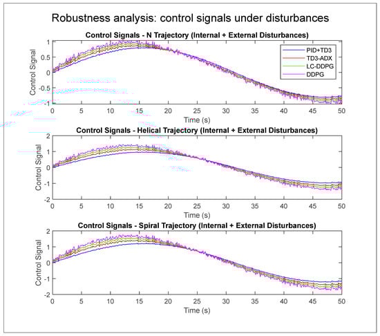 To evaluate the robustness of the proposed and benchmark controllers, internal and external disturbances were introduced during the execution of three different trajectory tracking tasks. Internal disturbances simulate modeling uncertainties such as parameter variations in the dynamic model, while external disturbances represent environmental factors like sudden external forces or torque perturbations applied at random intervals. The performance was assessed by analyzing the control signals generated by each controller, PID + TD3, TD3-ADX, LC-DDPG, and DDPG, under these conditions. As shown in Figure 10, PID + TD3 demonstrates superior robustness with smoother and more stable control actions compared to the other controllers, which exhibit higher fluctuation and noise when subjected to disturbances. This highlights the effectiveness of integrating a classical PID structure with a reinforcement learning agent in mitigating instability under real-world uncertainty. Table 8 presents the percentage improvement of hybrid PID + TD3 in terms of IAE, ISE, and RMSE, confirming its superior adaptability and stability under uncertain conditions.