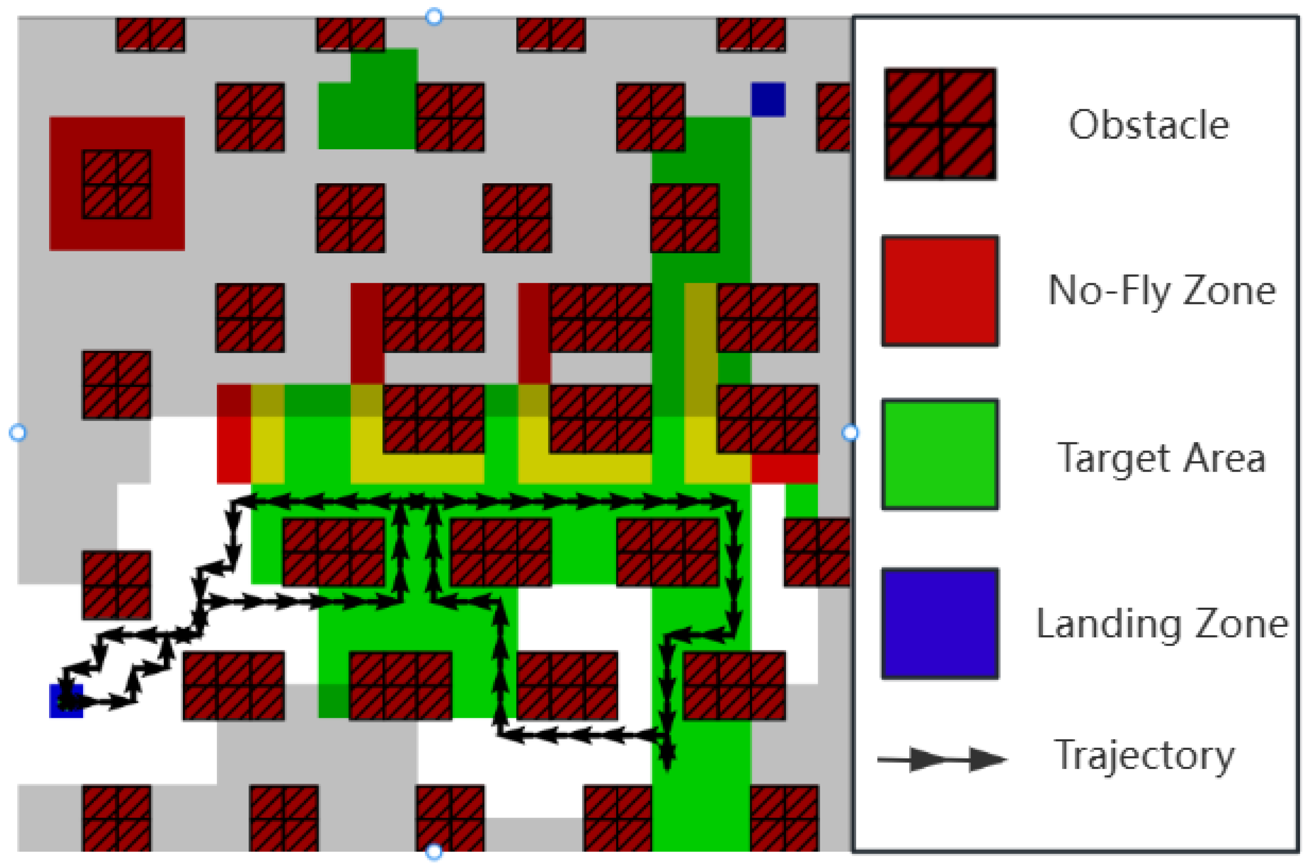 - Ni, J.; Gu, Y.; Gu, Y.; Zhao, Y.; Shi, P. UAV coverage path planning with limited battery energy based on improved deep double Q-network. Int. J. Control Autom. Syst. 2024, 22, 2591–2601. [Google Scholar] [CrossRef]