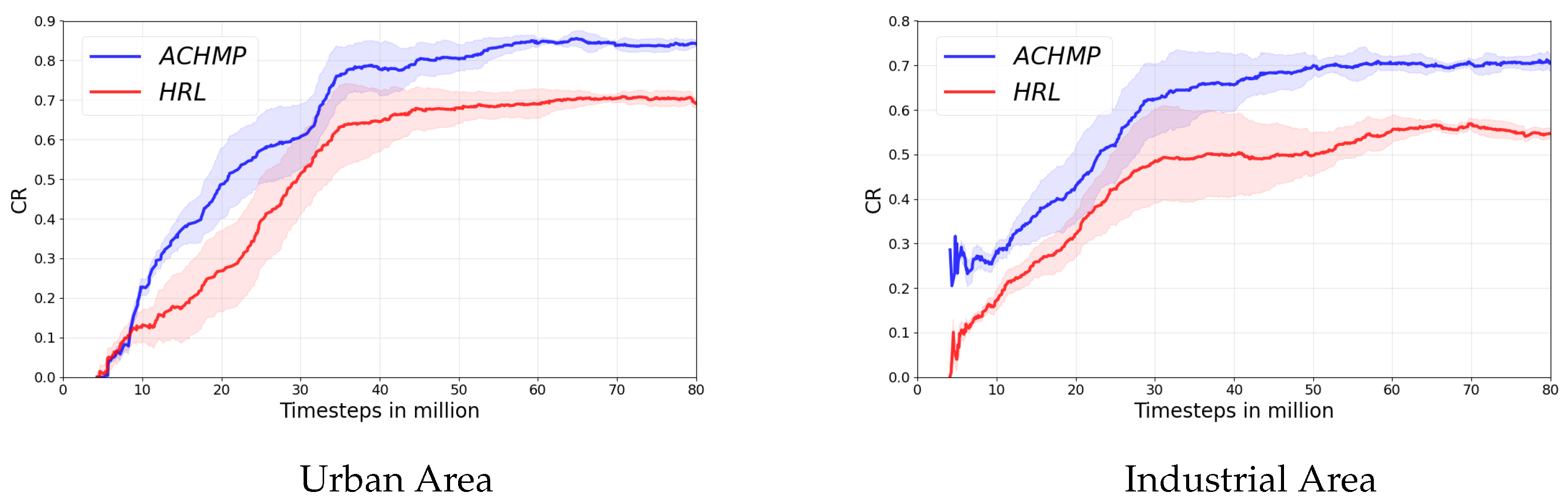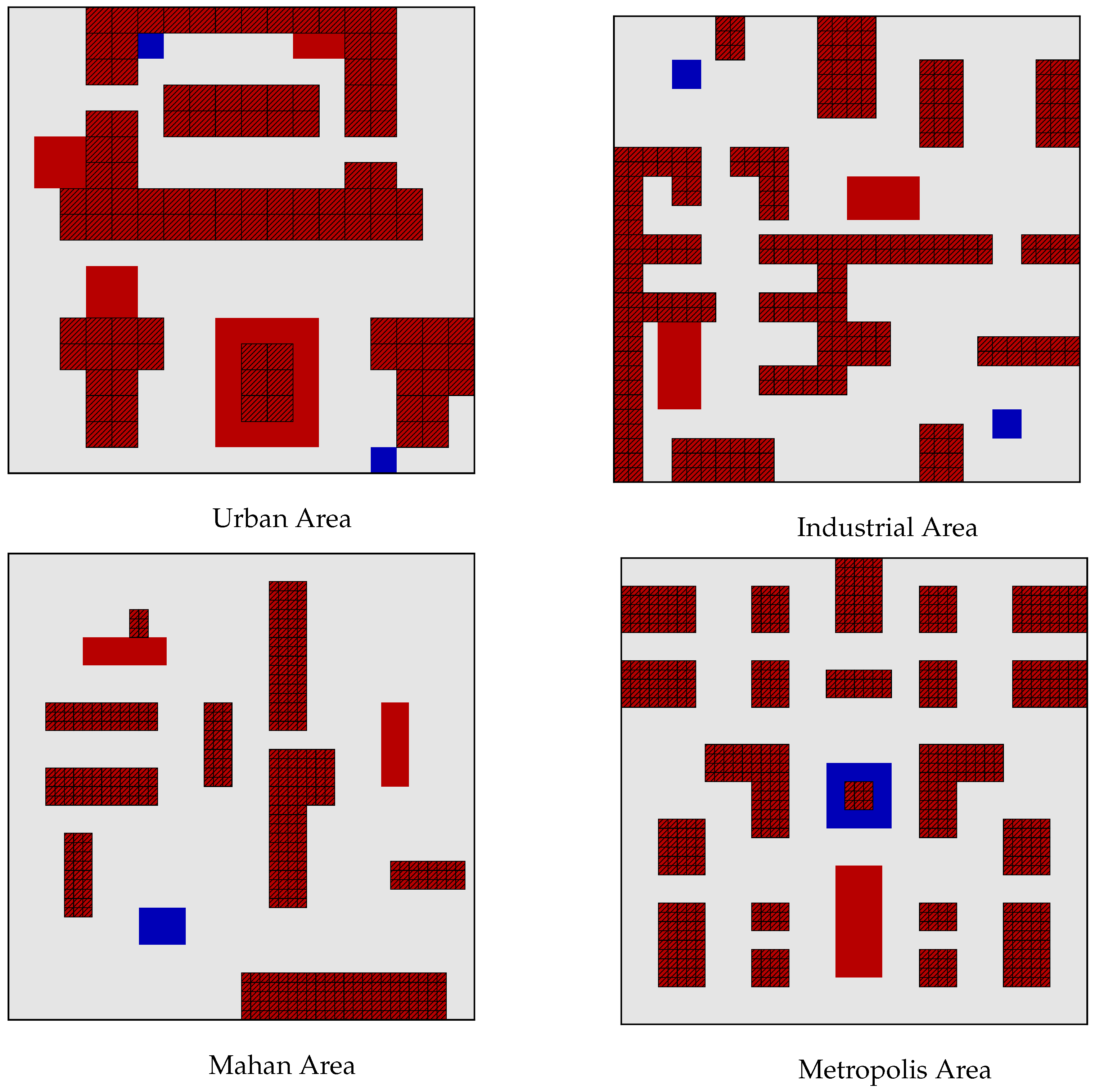 Figure 4 for this purpose. The ‘Urban Area’ and ‘Industrial Area’ serve as the primary environments for the initial validation of our Stage One (ACHMP) framework. Subsequently, the more complex ‘Mahan Area’ and ‘Metropolis Area’ are used for a test of our complete Stage Two (HRGL) model, comparing it against both the baseline and the Stage One results.