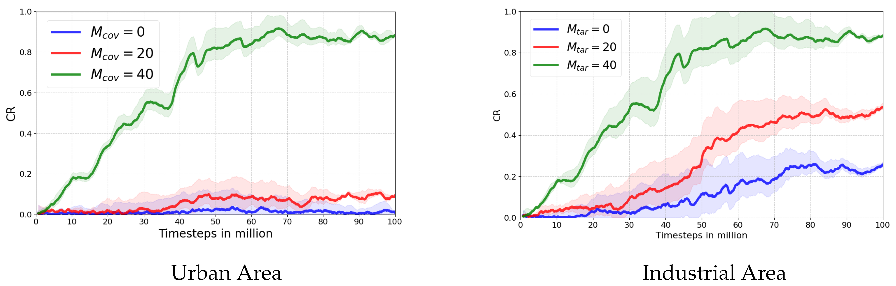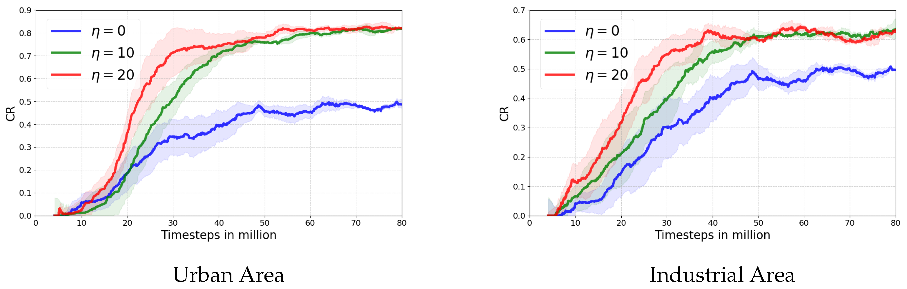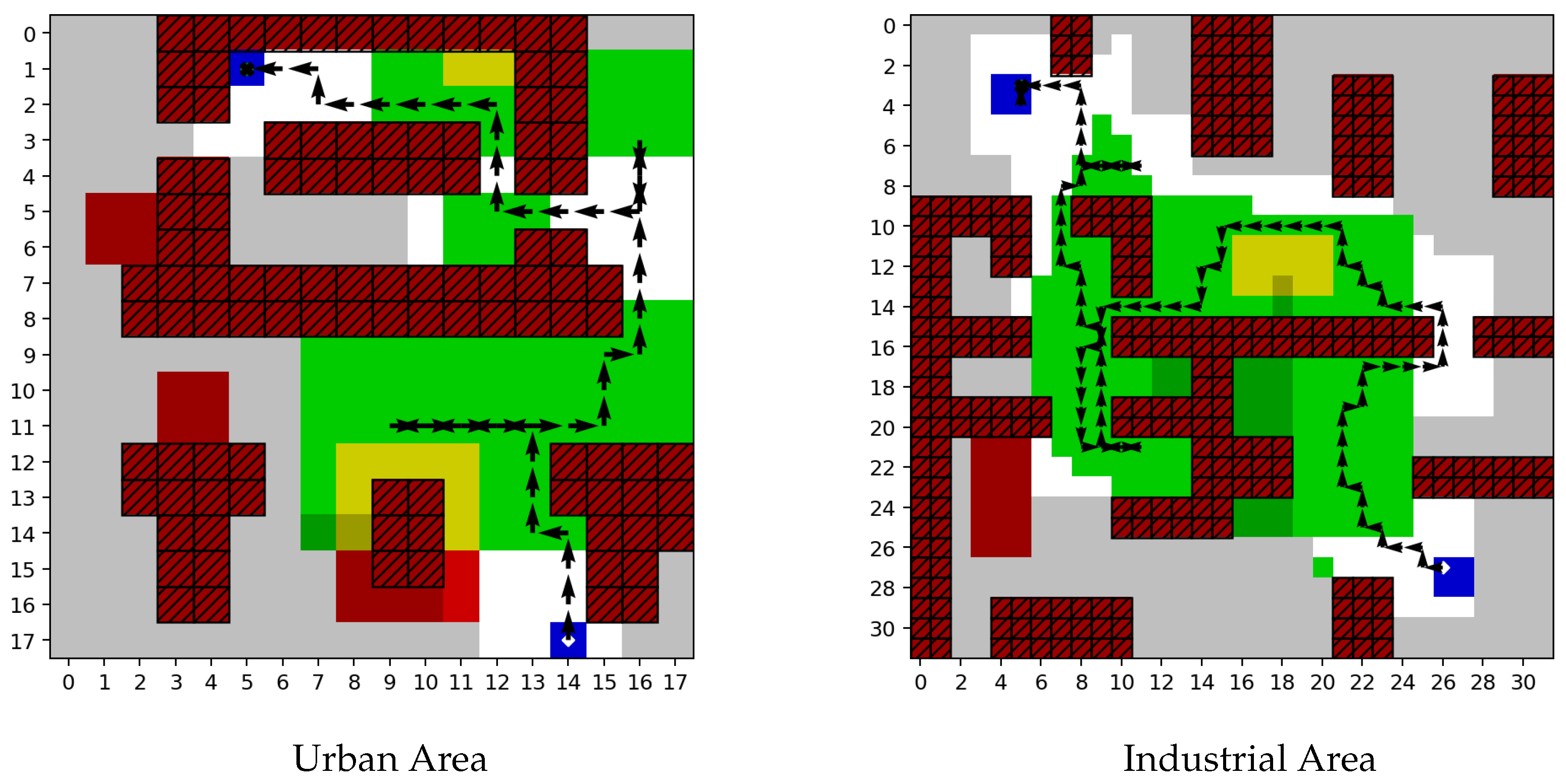 To comprehensively evaluate the performance and generalization capabilities of the algorithms, we conducted final tests in two distinct environments: the standard ‘Urban Area’ (18 × 18) and the larger, more challenging ‘Mahan Area’ (50 × 50). The quantitative results of the final trained policies are summarized in