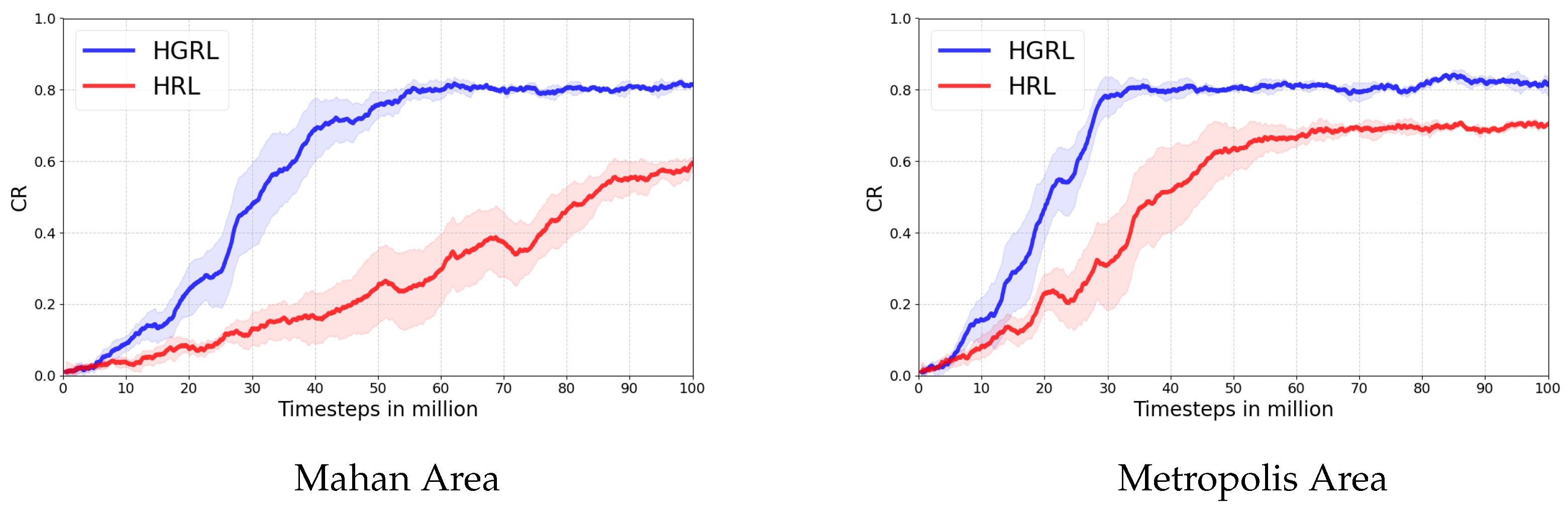 Figure 9a visually corroborate this finding. The curve for HRGL (blue) shows a significantly steeper descent than its counterparts, indicating a much faster learning speed. It quickly converges to a superior and more stable performance level, as evidenced by its narrow confidence interval.