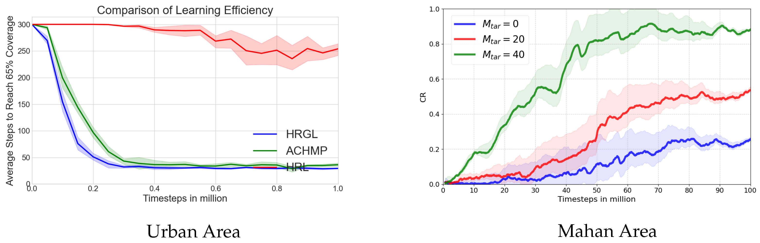 Table 1, on the relatively simpler Urban Area map, all methods demonstrate a reasonable ability to perform the task. We used a 65% coverage milestone to assess efficiency. Our HRGL method achieves the highest final coverage rate (87.5%) and is the most efficient, requiring only 29 steps to reach the 65% milestone. The learning curves in