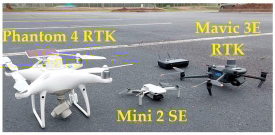 Three drones employed in this study, i.e., Phantom 4 RTK (P4), Mini 2 SE (M2), and Mavic 3 Enterprise RTK (M3).