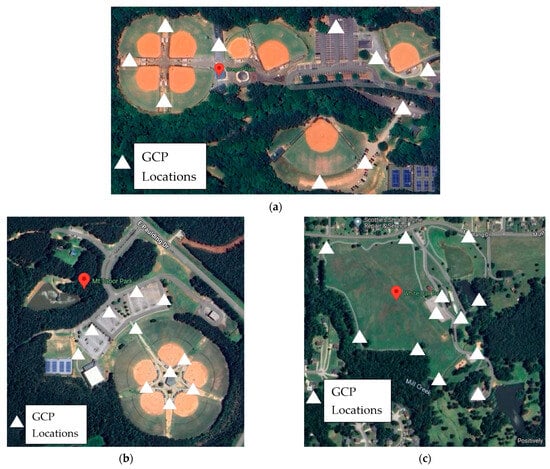 The spatial distribution of ground control points (GCPs) in three flight sites: Oregon Park (a), Mt. Tabor Park (b), and White Oak Park (c).
