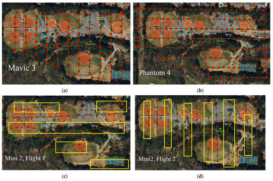Flight lines of different drones in Oregon Park. While flight lines of M3 (a) and P4 (b) were parallel and consistent with planned flight lines, those of M2 (c,d) were significantly distorted.