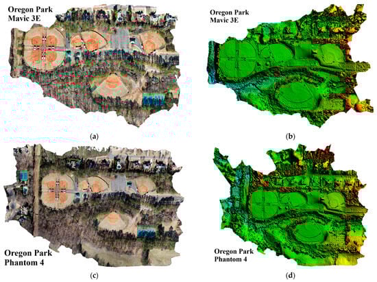 The orthomosaics and DSMs of Oregon Park using data collected by M3 (a,b) and P4 (c,d) drones.
