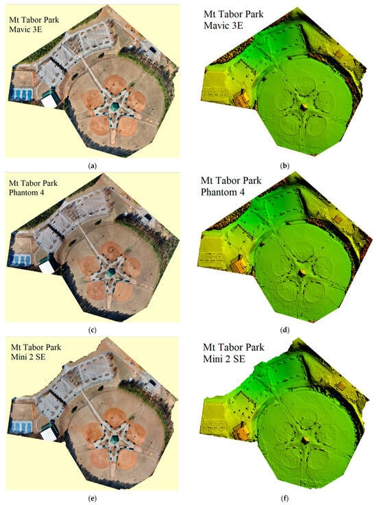 The orthomosaics and DSMs of Mt. Tabor Park using data collected by M3 (a,b), P4 (c,d), and M2 drones (e,f).