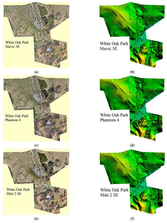 The White Oak Park’s orthomosaics and DSMs are indicated in the figures below, with a GSD of 0.028 m, 0.030 m, 0.034 m for M3, P4, and Mini 2 drones, respectively. Figure 6a,c,e depict that the orthomosaics have covered the entire site with very similar high clarity. Also, the DSMs (Figure 6b,d,f) show the elevation of the whole site with some expected distortion in water bodies and vegetated areas.