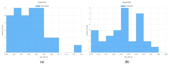 Figure 7 and Table 3 present the histogram and statistical measures of elevation differences between the ground points and DSM of Oregon Park. The histograms in Figure 7 indicate the number of ground points whose elevation differences from Oregon Park’s DSM fall within a certain range. For instance, Figure 7a shows that in the results of M3, the largest elevation difference in ground points occurred at the 0.15 m to 0.17 m interval with only one ground point, while most ground points (28 out of 33) had an elevation difference in the range of −0.03 m to 0.07 m. Similarly, Figure 7b indicates that in the results of P4, almost half (16 out of 33) of the ground points had an elevation difference between −0.07 m and −0.01 m, while four ground points had the largest elevation difference between −0.15 m and −0.13 m.
