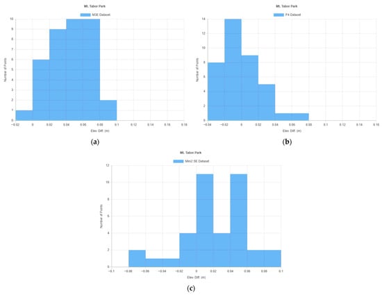 Histogram of elevation differences between ground points and DSMs generated from M3 (a), P4 (b), and Mini2 SE (c) drones in Mt. Tabor Park. The range of elevation differences in M2 is considerably larger than that of M3 and P4 drones.
