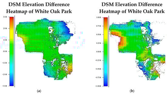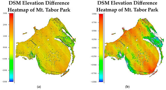 DSM of Mt. Tabor Park created from M3 and M2 data superimposed. The elevation difference between two DSMs is within 0.9 m (3 ft.) in almost the entire flight site except for the vegetated area (a), and it is within 0.3 m (1 ft.) in most of the site (b).