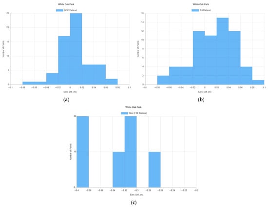 Histogram of elevation differences between ground points and DSMs generated from M3 (a), P4 (b), and Mini2 SE (c) drones in White Oak Park. The range of elevation differences in M2 is significantly larger than that of M3 and P4 drones.