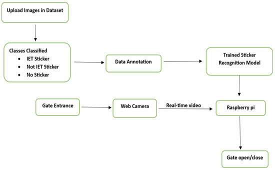 The case study is carried out at th NFC Institute of Engineering & Technology, Multan, Pakistan, where the administration issues authorized identification stickers to permitted vehicles (student, visitor, and staff personnel). Currently, security personnel manually check these stickers at the main gate, while vehicles without stickers must undergo clearance before entry. In the proposed system, the automated gate control will open for vehicles with authorized stickers and restrict access (or redirect them for manual entry and checking) for those without them, thereby overcoming the limitations of manual security. The overall methodology involves collecting an image dataset of all probable cars approaching the entry gate, whether they have an authorized sticker, another type of sticker, or no sticker at all. The step-by-step implementation is shown in Figure 1.