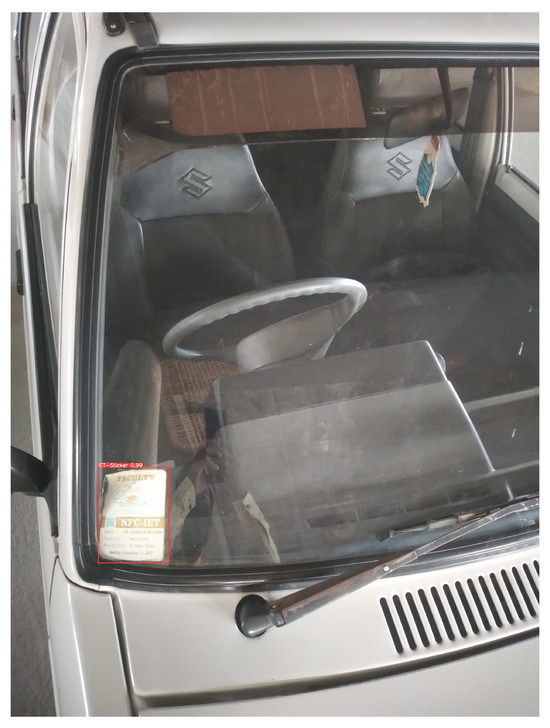 After training, we tested the model using the test set (10% of the total dataset) to validate how well the model generalized to unseen images. The evaluation revealed that the model was capable of identifying stickers with high confidence even under challenging lighting conditions and partial occlusion. The classes with fewer examples, e.g., “No Sticker”, performed slightly lower in precision, as can be seen in Figure 5.