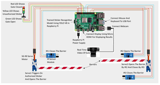 To ensure reliability and real-time performance, the hardware implementation of the automated gate control system was implemented using Raspberry Pi-4. Raspberry Pi 4 serves as the central processor, and it is used to handle the process of localizing and classifying the type of sticker on the vehicle and further execute the gate control mechanism. A webcam attached to it will process real-time videos, and this enables the servo motor to open the gate in authorized vehicle cases. For the given image resolution, the optimized YOLOv8n model runs on Raspberry Pi 4 with 4 GB RAM and a Quad-Core Cortex-A72 processor, achieving about 3–5 FPS. The frame rate can be improved by reducing the image’s size, although this results in a corresponding decrease in accuracy. The key connected components are IR sensor modules, servo motors [19], LEDs with the GPIO pins of Raspberry Pi [20], and a webcam using the USB port of Raspberry Pi to capture real-time videos of gate entrances. Each hardware component played a specific role, collectively enabling the automatic operation of the entry gate. The overall schematic of the hardware model is shown in Figure 7.