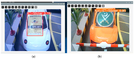 Detection results from Raspberry Pi 4 prototype for automated gate control via vehicle sticker recognition. (a) Detection of authorized vehicle with sticker; (b) unauthorized vehicle without sticker.