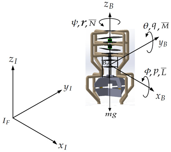 In this section, the mathematical model that describes the coaxial-rotor MAV dynamics based on the Newton–Euler formulation [13,14,15,16,17,18] is presented. The Earth’s curvature is not considered due to the coaxial-rotor MAV flying short distances. To obtain the mathematical model, two coordinate frames are considered— and (see Figure 1)—with knowledge as the inertial fixed frame and the body frame, respectively. The body frame is fixed and attached to the center of gravity of the coaxial-rotor MAV [19,20]. The general coordinates for the coaxial-rotor MAV are defined as . The mathematical model of the coaxial-rotor MAV is given by: