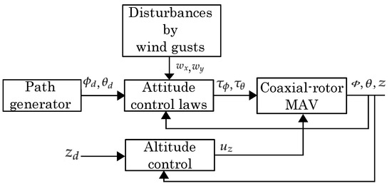 with , z is the actual altitude obtained from Equation (7), and is the desired altitude, m is the total mass of the coaxial-rotor MAV, g is the gravitational constant. The control scheme is presented in the Figure 2.