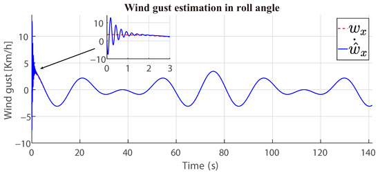 The Equation (44) is negative definite (see Figure 3). It is possible to achieve definite global stability with the adaptive control law (43) for the system (14) and (15), which defines the roll angle in the coaxial-rotor MAV. Finally, the adaptation gain is defined by , and it bounded; Figure 4 presents the convergence of the wind gust estimation ().