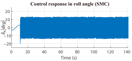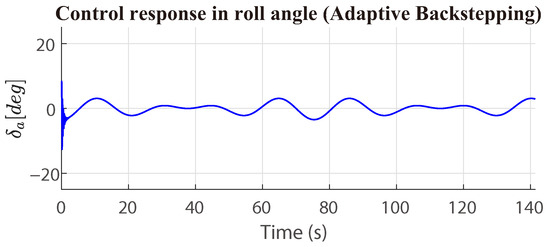 Analysing the control effort in the Table 1, the first-order sliding mode control (SM) presented a considerable control effort to achieve the control objective in the roll angle, and presented a bigger chattering effect in comparison with the second-sliding mode control (2SM), and the high-order sliding mode (HOSM); see the Figure 11, Figure 12 and Figure 13. The control signal response for the backstepping adaptive law is presented in Figure 14.