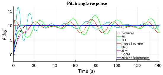 The pitch angle responses with the linear and nonlinear controllers are presented in Figure 15. The linear controllers PD and PID presented oscillations on the desired pitch angle, and the same signal is given by the nested saturation control, which occurred due to the wind gusts. The second-order sliding mode (2SM) achieves the desired pitch angle as an overdamped signal. The first-order sliding mode control (SM), adaptive backstepping technique, and the high-order sliding mode (HOSM) achieve the desired pitch angle as a critically damped signal form; see the Figure 15.