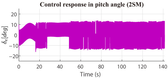 The PID control presented a small control effort to achieve the desired pitch angle, and the first-order sliding modes applied a considerable control effort to achieve the desired pitch angle; see Table 2. Furthermore, as shown in Figure 19, Figure 20 and Figure 21, the first-order sliding mode control exhibits the most significant chattering effect compared to the second-order sliding mode (2SM) and high-order sliding mode (HOSM) controllers.