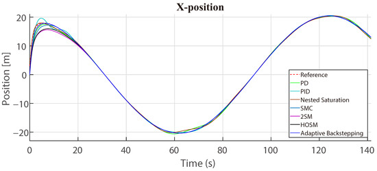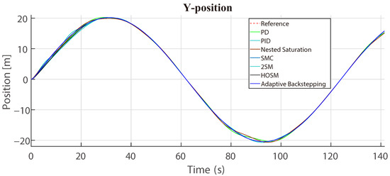 In Figure 23 and Figure 24, the trajectory followed by the coaxial-rotor MAV and every linear and nonlinear controller in the x-axis and y-axis, respectively, are presented. The altitude is affected by the disturbances caused by wind gusts, which can be seen in Figure 25. Finally, in Figure 26, the complete trajectory to follow by the coaxial-rotor MAV is presented.