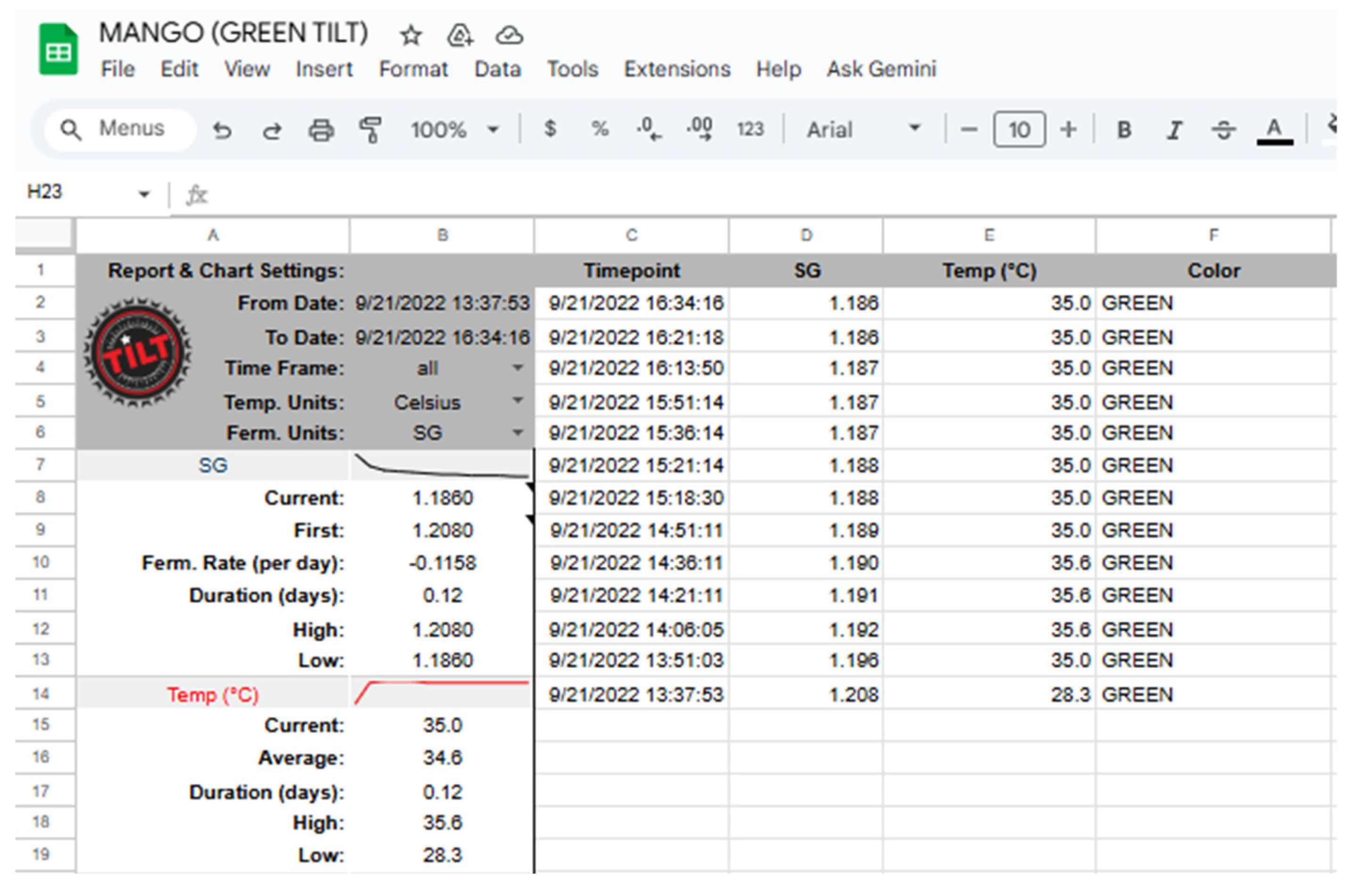 - Schlegel, B. Review: TILT Electric Hydrometer Tracking Specific Gravity over Time. Available online: https://bierbot.com/blog/hardware-reviews/tilt-electric-hydrometer-specific-gravity/ (accessed on 16 April 2025).