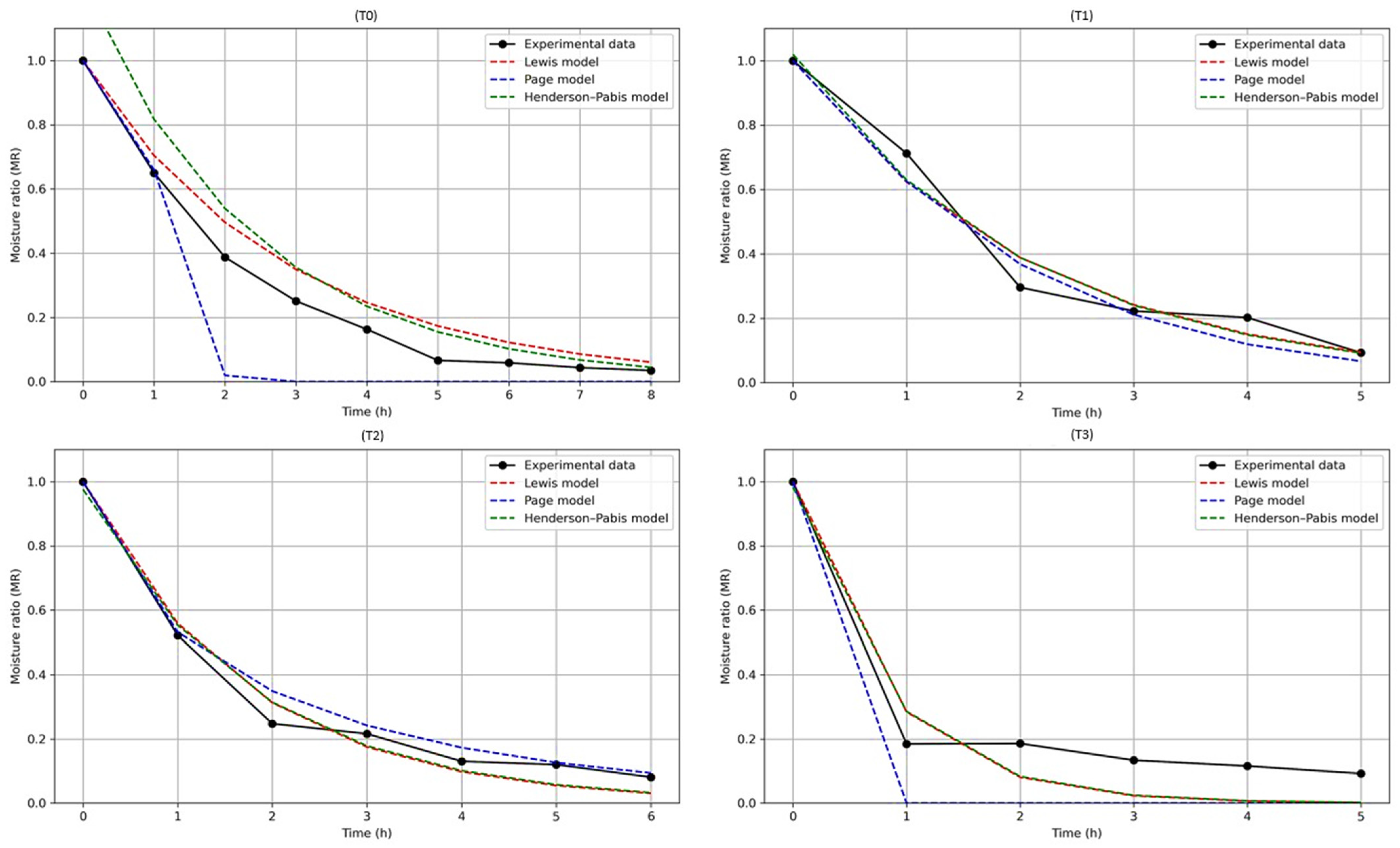 | T0 | Lewis Page Henderson–Pabis | k = 0.3507 k = 0.4161, n = 3.2455 a = 1.2388, k = 0.4161 | 0.7370 0.8557 0.7786 | 0.2332 0.1728 0.2140 |