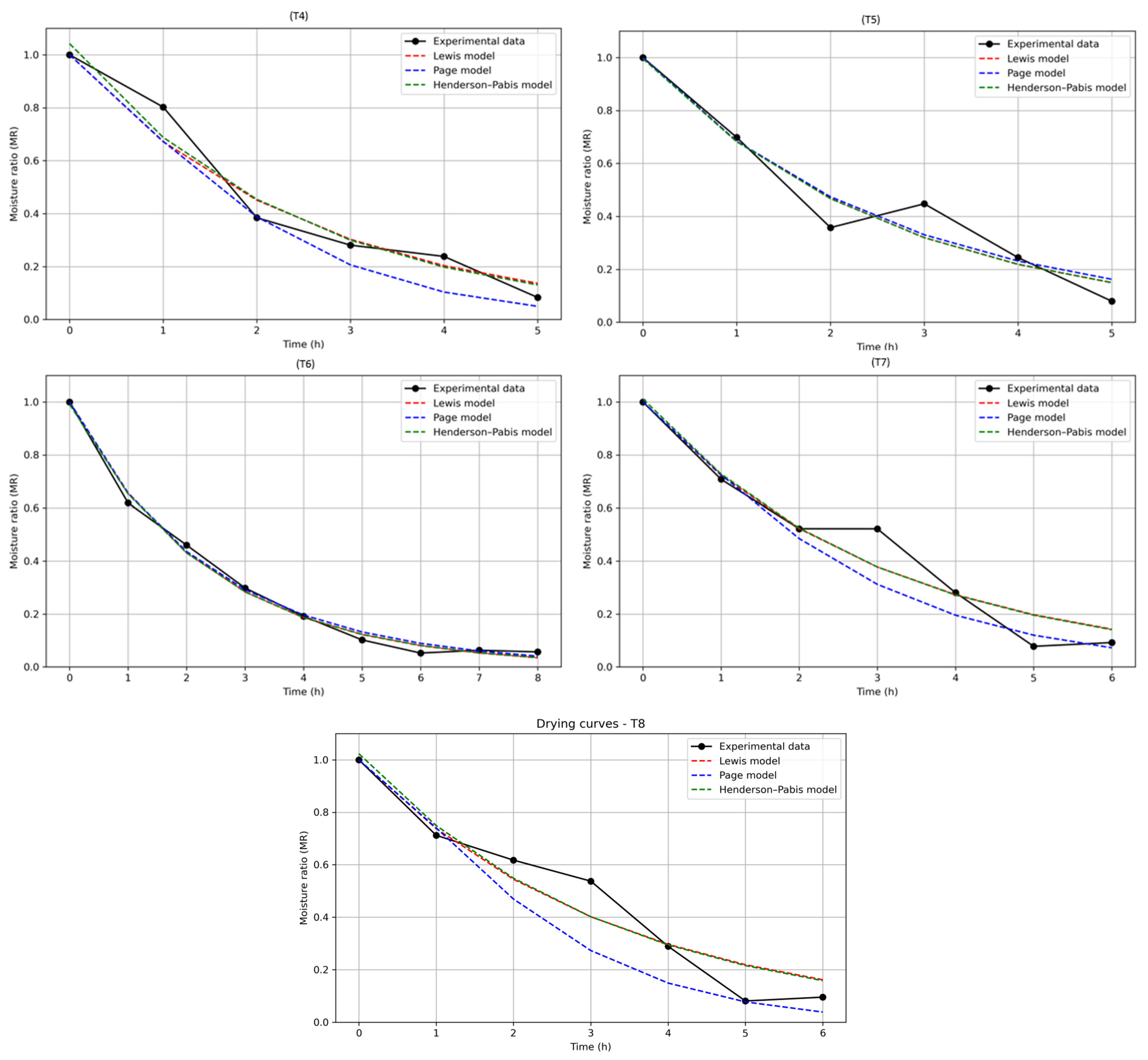 | T8 | Lewis Page Henderson–Pabis | k = 0.3042 k = 0.3007, n = 1.3325 a = 1.0232, k = 0.3118 | 0.9306 0.9485 0.9317 | 0.0828 0.0713 0.0821 |
