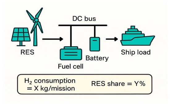 The proposed hybrid system architecture is shown in Figure 1, which illustrates power flow from renewable sources (RES) to the DC bus through the fuel cell (FC) and battery and then to the ship load. The lower ribbon indicates mission-level hydrogen consumption and the share of renewable energy.