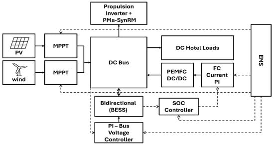 While the literature does not show many examples of a pure PI-based EMS specifically applied to combined wind/PV/FC/battery shipboard systems, due to the emergent nature of this integration, the demonstrated success of PI in related DC microgrids [,] and diesel–battery hybrid [,] systems provide confidence in its feasibility. In this study, therefore, the EMS uses coordinated PI loops, one monitoring battery SOC to command PEMFC output for maintaining charge balance, and another controlling DC-bus voltage for stabilizing power interchange among all sources. This configuration is in agreement with the results of Jung & Chang [] and Nivolianiti et al. [] and confirms that a rule-based EMS, although not mathematically optimal, is reliable and efficient real-time energy management for marine hybrid microgrids.