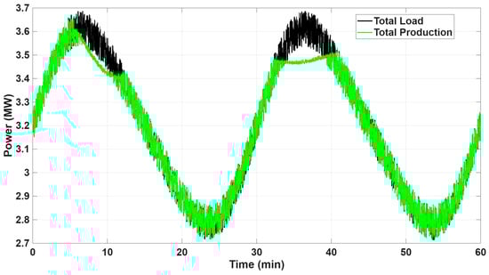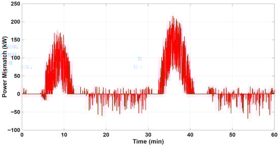 Figure 10 shows the instantaneous power imbalance (the difference between total load and total generation) during the one-hour mission. The data show that the deviations from equilibrium are short and well-constrained with two significant positive excursions during high propulsion intervals around t ≈ 10 min and t ≈ 35 min, where the imbalance is maximum at about +180 to +200 kW for less than 5 min in both cases. Negative excursions are seldom more than −60 kW and typically last for a few seconds, typical of transient periods when combined generation (including short periods of battery discharge) exceeds demand. Throughout the mission, the hybrid control strategy keeps the absolute power mismatch below 20 kW on average and the DC-bus voltage between 715 and 785 V (5% of nominal). These quantitative results validate the effectiveness of the coordinated energy management strategy in ensuring robust power sharing among the FC, BESS, and renewable sources, protecting the lifetime of the components and guaranteeing uninterrupted service to both propulsion and hotel loads. When compared with validated marine hybrid studies, this level of dynamic balance is in line with the most stable shipboard microgrids in the literature. Penga et al. [] showed similar transient characteristics in a 300 kW PEMFC–battery catamaran, where instantaneous mismatches were rarely more than ±0.2 MW and were within ±6% of nominal power. Shakeri et al. [] confirmed that a 1 MW FC–battery hybrid could provide a stable regulation of the DC bus of ±5% under hardware-in-the-loop validation with fast recovery after propulsion surges. Kamel et al. [] also achieved a deviation in power sharing of about ±5% in a PV–FC–battery–supercapacitor DC microgrid using PI droop coordination. In comparison, optimization-based EMS strategies like the DRL controller by Jung & Chang [] and the PSO-based approach by Bagherabadi et al. [] provide slightly smoother transient responses (about ±3–4%) but with much higher computational efforts and no on-board certifiability. Consequently, the current configuration’s ±6% peak-to-peak mismatch—achieved at a realistic 3 MW marine loading with a single-layer PI—is a satisfactory proof of concept for a robust balance between responsiveness, simplicity, and real-time feasibility for maritime applications.
