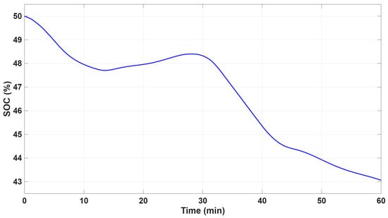 Figure 9 illustrates the evolution of the DC-bus voltage throughout the one-hour mission and demonstrates the effectiveness of the PI-based voltage regulation. Starting from the nominal set-point of 750 V, the bus voltage exhibits three gentle “step-and-hold” plateaus caused by brief residual surpluses or deficits between generation and demand. The voltage first rises slightly to about 760 V within the initial 5 min as early renewable surpluses charge the bus capacitor, then stabilizes near that level until around 30 min, when a second mild surplus elevates it to approximately 770 V. It remains steady near this value until the end of the mission. At all times the DC bus is comfortably maintained within the prescribed ±5% tolerance band (≈715 V to 785 V), with no excursions approaching the safety limits. These quantitative observations confirm that the combined action of the battery’s grid-forming converter and the FC drop control successfully balances fast load variations and renewable intermittency, while the floating-capacitor model realistically captures the small discrete voltage rises produced by uncompensated residual energy. Maintaining the DC bus voltage within 750 ± 20 V without overshoot or oscillations describes the robustness of the proposed PI-controlled microgrid and ensures a reliable power supply to propulsion and hotel loads. In comparative terms, achieved voltage stability is in close agreement with, or better than, results reported in previous validated studies. Kamel et al. [] reported a voltage deviation of ±5% in a PV–FC–battery–supercapacitor DC microgrid under PI, a value that is consistent with the ±4.8% deviation reported in the present system. Shakeri et al. [] obtained sub-second voltage recovery (about 1 s) during hardware-in-the-loop marine hybrid testing, while Xie et al. [] ensured ±3–4% DC voltage using a two-layer hierarchical PI framework for multi-stack PEMFC vessels. Similarly, Bagherabadi et al. [] and Pietra et al. [] validated the occurrence of voltage bands of ±5–6% under dynamic loading from sea state. In contrast, optimization-based strategies, such as the DRL-based EMS of Jung & Chang [] and the PSO-based EMS of Peng et al. [], achieve similar or slightly tighter ranges of voltage but require significantly higher computational overhead and are not certified for onboard deployment. The present system, providing near-identical DC stability with a single-layer PI scheme, represents a practical, certifiable compromise between real-time responsiveness and control simplicity, making it ideally suited for medium-scale hybrid vessels operating in variable marine conditions along the Saudi coast.