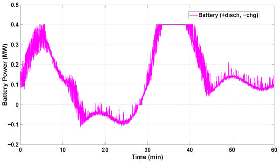 with battery capacity (defined so SOC = 1 when fully charged). The bidirectional DC/DC converter controls Vb to hold the DC bus near 750 V and enforces current limits during charge/discharge []. In pure DC-bus operation, the battery’s controller acts as a voltage source (grid-forming) maintaining the bus voltage and providing (droop or master–slave) power sharing with other sources.