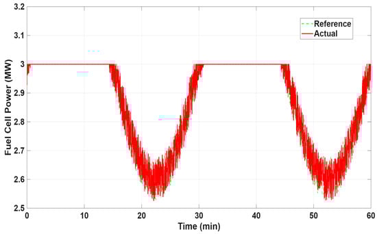 Figure 11 compares the commanded (reference) and measured (actual) power of the PEMFC over the course of the one-hour mission and shows the dynamic performance of the PI-based control and the effect of the imposed ramp-rate limit. The reference profile is based on the low-frequency oscillations of the propulsion demand of the vessel, while the actual FC output is close to these commands with negligible steady-state error (<1%). During high-power propulsion segments around 0–5 min, 30–35 min, and 55–60 min, the reference briefly reaches the 3 MW upper setpoint, and the FC correspondingly saturates at ~3 MW, in full agreement with its rated capacity. In the intervening low-load intervals, the commanded power decreases smoothly to approx. 2.55 MW, and the actual output follows with a gentle slope limited by the predefined 80 kW s−1 ramp constraint; this ramp-limited tracking ensures gradual transients, reducing mechanical and electrochemical stress on the stack. The BESS covers any short-term imbalance during these transitions, discharging up to 0.4 MW when power from propulsion increases faster than the FC can react and recharging when load is more abruptly decreased. This quantitative agreement between reference and actual power over the full cycle confirms that the proposed PI-based EMS effectively maintains stable operation, respects the FC’s dynamic constraints, and prolongs component lifetime while meeting the vessel’s real-time power requirements. When compared with previously validated studies, the obtained ramp-limited tracking and negligible steady-state error (<1%) are consistent with high-fidelity FC dynamic control benchmarks. Penga et al. [] achieved a similar current-following accuracy within ±1.5% in a 300 kW PEMFC–battery ferry model validated experimentally, while Shakeri et al. [] reported dynamic tracking within ±2% under 1 MW HIL tests using feedforward–feedback control. Ghimire et al. [] demonstrated controlled current ramping in marine hybrid systems with slope limits between 60 and 100 kW s−1—closely matching the 80 kW s−1 applied here—and verified that such limits prevent voltage overshoot during transient surges. Similarly, Kamel et al. [] observed stable current tracking and ±5% voltage recovery in a PV–FC–battery–supercapacitor DC microgrid using PI. In contrast, optimization-based controllers such as the DRL strategy of Jung & Chang [] and the PSO-based EMS of Peng et al. [] achieved slightly faster convergence (≈0.8 s vs. 1.1 s) but required greater computational resources and real-time tuning complexity. Therefore, the present configuration—achieving ±1% power-tracking error and smooth ramp behavior with a single-layer PI controller—demonstrates a practical, certifiable, and computationally efficient solution well suited for medium-scale marine hybrid propulsion systems operating under realistic dynamic sea conditions.