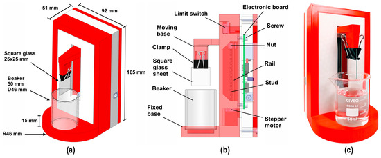The mechanical layout is a compact vertical frame that integrates the sample holder, beaker platform, and motion train in a single enclosure to ensure alignment and repeatability. The overall external dimensions are 165 mm (height) × 92 mm (width) × 51 mm (depth) with a rounded base of R46 mm and 15 mm thickness, yielding a small laboratory footprint (Figure 3a). The working area is configured for standard small-format experiments: a 25 × 25 mm square glass substrate is retained by a spring clamp and aligned over a beaker station sized for a 50 mL vessel (Ø46 mm, height 50 mm). The geometry provides unobstructed vertical travel for immersion and withdrawal while keeping the mass close to the guide to minimize pitch/roll.