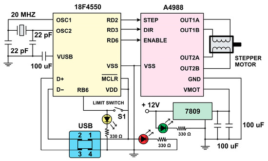 Figure 5 shows the wiring that interfaces a PIC18F4550 microcontroller with an A4988 stepper driver using separate supplies for logic and motor power. The MCU is clocked by a 20 MHz crystal (22 pF load capacitors) and powered at VDD = 5 V from the USB rail; VUSB is bulk-decoupled with 100 μF to stabilize bus transients. Motion commands are issued on three digital outputs—STEP (RD2), DIR (RD3), and ENABLE (RD6)—and routed to the A4988; logic grounds (VSS) are common between devices to ensure clean edge timing. The limit switch S1 is connected to a protected MCU input and used for homing and over-travel detection. The USB connector also provides the D+/D− data lines for the HMI link.