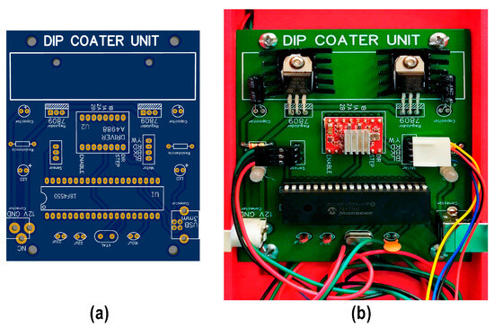 Controller electronics. (a) PCB layout of the dip-coater controller, (b) assembled controller board integrated in the instrument.