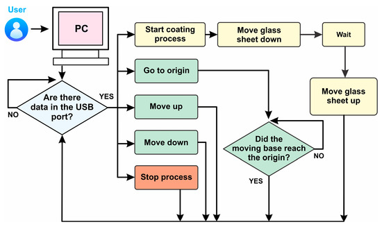 Figure 7 summarizes the HMI–controller interaction used to execute a coating cycle. The PC application allows the user to specify the set-points—dip depth, cruise speed, and dwell time—and to issue high-level commands (“Go to origin”, “Move up”, “Move down”, “Start coating process”, “Stop process”). The microcontroller runs a polling loop (Are there data in the USB port?): when a command frame is available it is parsed and acknowledged, otherwise the firmware remains in an idle state while reporting the current stage position and system status. The “Go to origin” routine repeatedly drives the carriage upward until the limit switch is asserted; origin status is latched and returned to the HMI for display. When “Start coating process” is triggered, the controller executes a parameterized rise–dwell–fall sequence: (i) Move glass sheet down at the commanded speed to the requested immersion depth; (ii) Wait for the programmed dwell; and (iii) Move glass sheet up to withdraw the sample. At any time, “Stop process” preempts motion, disables the driver, and returns the system to a safe idle.