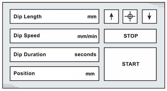 A well-designed GUI is essential because it translates experimental intent into safe, repeatable machine actions. By exposing only the required parameters with explicit units and bounds, it reduces entry errors and standardizes procedures across users—critical for reproducibility. Figure 8 shows the GUI concept, implemented in Microsoft Visual Studio. It is intentionally minimalist: only the essential inputs—Dip Length (mm), Dip Speed (mm/min), and Dip Duration (s)—are exposed, alongside a read-only Position (mm) readout for real-time feedback. Three large icons provide direct manual control (up, home/origin, down), while START and STOP occupy prominent buttons for unambiguous execution and immediate abort.