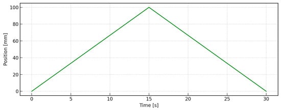 Prior to hardware testing, an ideal “fast dip–withdraw” cycle was simulated, employing a triangular position command with a stroke of and a total cycle time of (no dwell). The half-cycle is 15 s, so the carriage moves at constant speed from 0 to 100 mm and then back to 0 mm, with initial/terminal conditions , , . Acceleration is identically zero except at the switching instants , where it is impulsive in the ideal model; in practice these impulses would be replaced by short ramps within actuator limits. The profiles are computed in closed form and sampled at . Figure 9 shows the commanded position: a perfect triangle with linear ascent from 0 to 100 mm in 15 s and linear descent back to 0 mm by 30 s. The waveform verifies that stroke and time bounds are met exactly, providing a simple reference for open-loop step counting and for checking end-stop logic in the sequential controller.