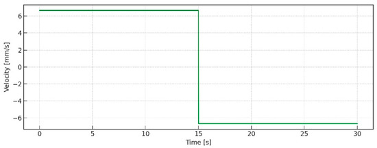 Figure 10 displays the corresponding velocity, which is piecewise constant at during the first half of the cycle and during the second half, with a sign inversion at . This constant-magnitude speed is attractive when only a quick down/up action is needed (e.g., rapid immersion and immediate withdrawal) and when uniform interface speed during each leg is preferred.