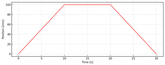 To emulate a dip–soak–withdraw cycle, a trapezoidal position command with linear rise, dwell, and linear fall segments was simulated. The carriage starts at , reaches in , holds for , and returns to in (total ). The corresponding constant speeds are during the rise, during the dwell, and during the fall. Profiles were computed analytically and sampled at . Figure 12 shows the piecewise-linear ascent from 0 to 100 mm over 0–10 s, a flat plateau at 100 mm for 10–20 s, and a linear return to 0 mm over 20–30 s—capturing the common requirement to reach depth, dwell for wetting/reaction, and withdraw at a controlled rate.