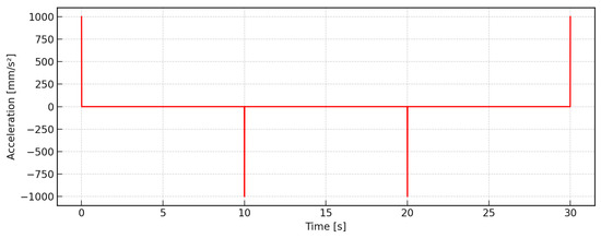 Figure 14 depicts the idealized acceleration: zero except for impulses at the segment boundaries (0, 10, 20, 30 s) that represent instantaneous velocity changes. On hardware, these impulses are replaced by short finite-acceleration ramps sized to motor torque/current limits while preserving the commanded dwell and segment speeds.