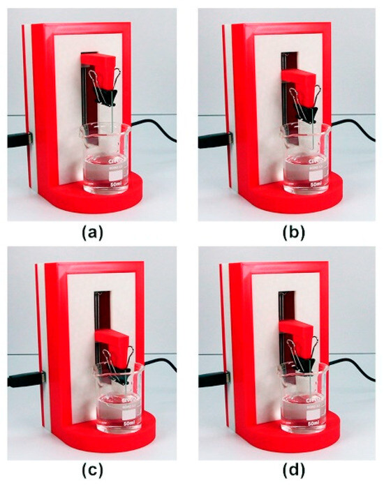 A longitudinal section of the mechanism is presented in Figure 3b. Vertical motion is generated by a stepper-driven lead screw acting on a nut rigidly coupled to the moving base that carries the clamp. A linear rail constrains the carriage and guarantees straightness of motion, while a limit switch located at the upper end is used for homing and over-travel protection. The controller and stepper driver are mounted on an internal electronic board, minimizing wiring and allowing a short, low-inductance path to the motor. The fixed base centers the beaker beneath the slot so that the sample remains collinear with the travel axis throughout the stroke.