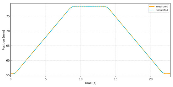 Figure 17 shows measured (solid orange) and simulated (dashed blue) position versus time. The two traces almost completely overlap: the ascent and descent slopes match closely, and the plateau is aligned in level and duration, indicating that the identified speed, stroke, and dwell capture the experiment well. Small, smooth roundings at the turning points reflect the bounded acceleration used in the drive and minor mechanical compliance; a slight phase lag of only a few tens of milliseconds is visible at the slope changes, consistent with timestamping/measurement latency. Overall, the agreement validates the position model for this motion program.