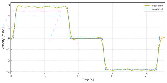 Figure 18 shows the velocity comparison between the measured (orange) and simulated (blue dashed) profiles for the rise–dwell–fall program. During the upstroke (), the measured speed ramps to a steady , closely matching the reference; the small ripple () is consistent with differentiation noise and microstepping ripple. Entering the dwell, a slight phase lag and brief undershoot are visible, after which the velocity remains effectively zero (<) over , confirming the hold at depth. At the start of the downstroke (), the measured trace shows a short overshoot to about before settling near to , again tracking the simulated constant segment. The final stop near exhibits a small rebound but converges to zero promptly. Overall, the measured velocity follows the commanded piecewise-constant profile with only minor, physically expected deviations at the switching instants.