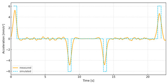 Figure 19 compares the acceleration traces. The dashed curve indicates the simulated switching instants—start, brake into dwell, brake out of dwell, and final stop. The four measured extrema coincide temporally with these events, with peak magnitudes of roughly . Between events, acceleration oscillates about zero with low-amplitude ripple, consistent with numerical differentiation, microstepping torque ripple, and minor structural compliance. Overall, the controller issues the expected braking/starting actions at the correct times; the small amplitude discrepancies are attributable to smoothing and measurement artifacts rather than systematic timing errors.